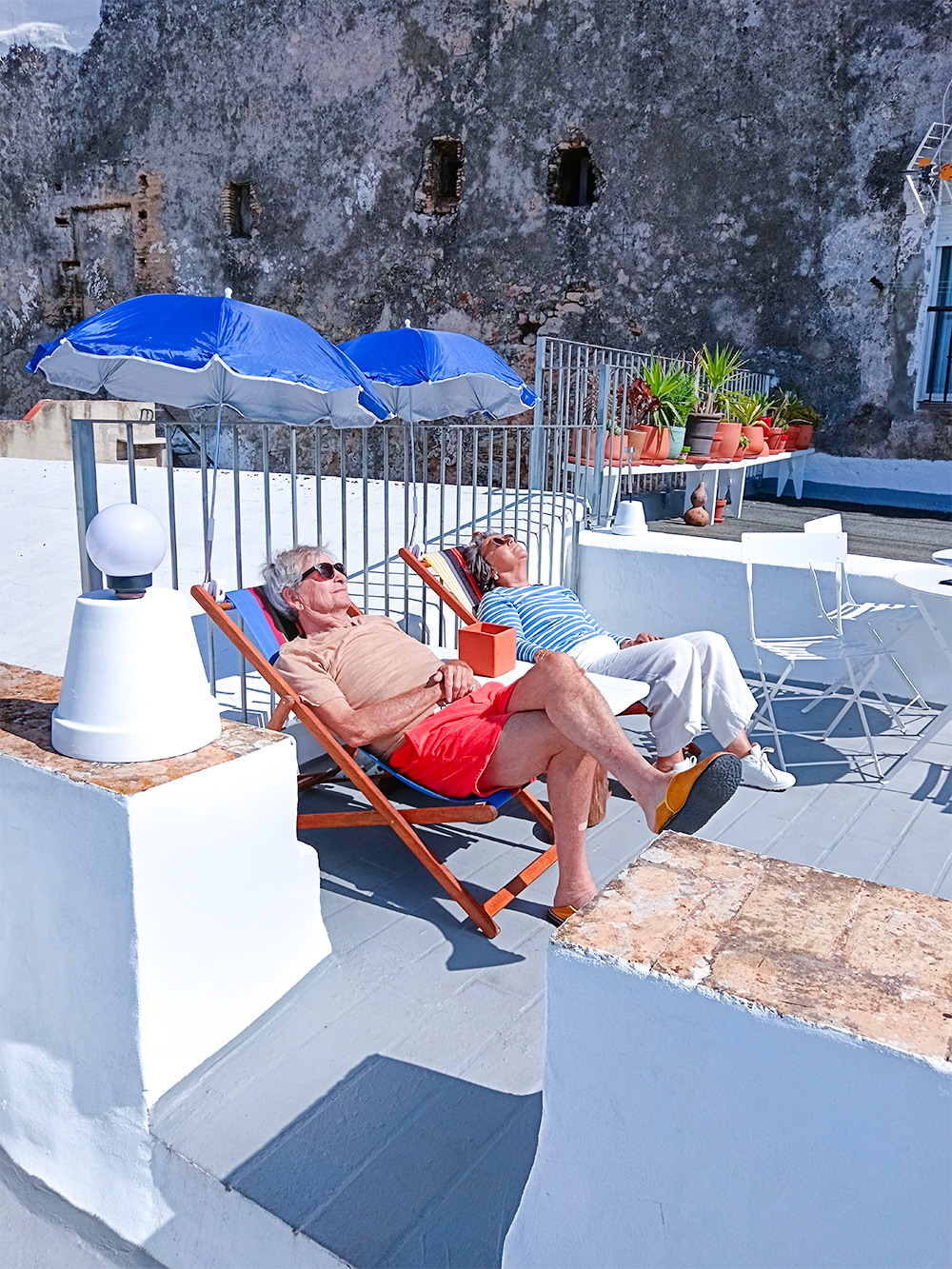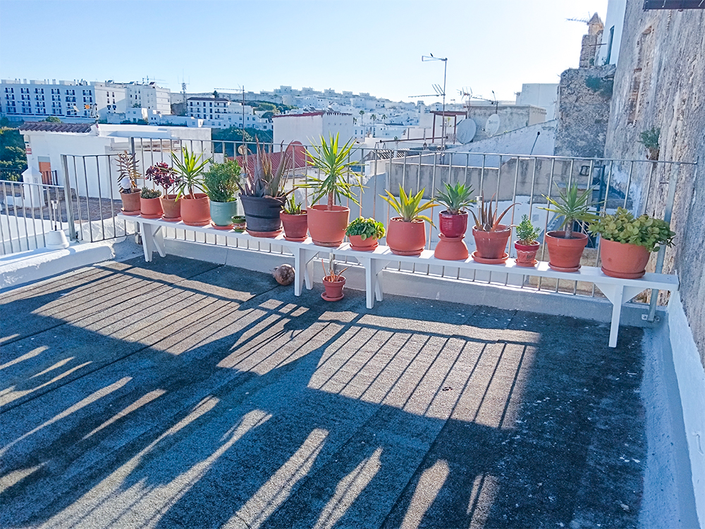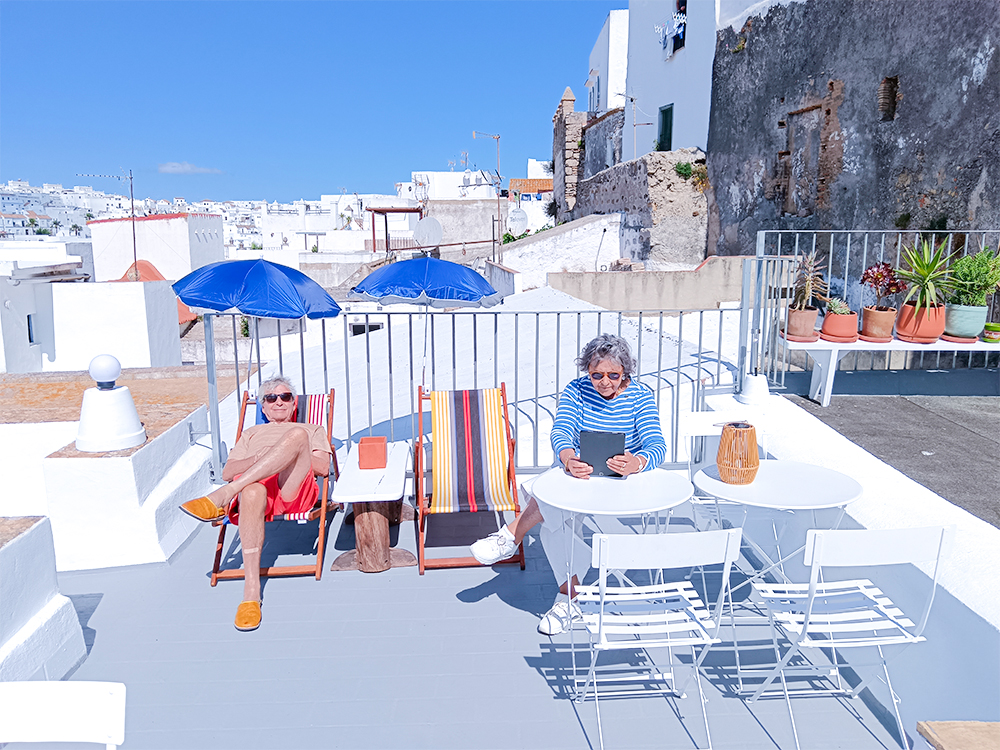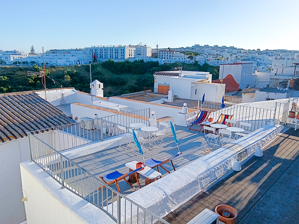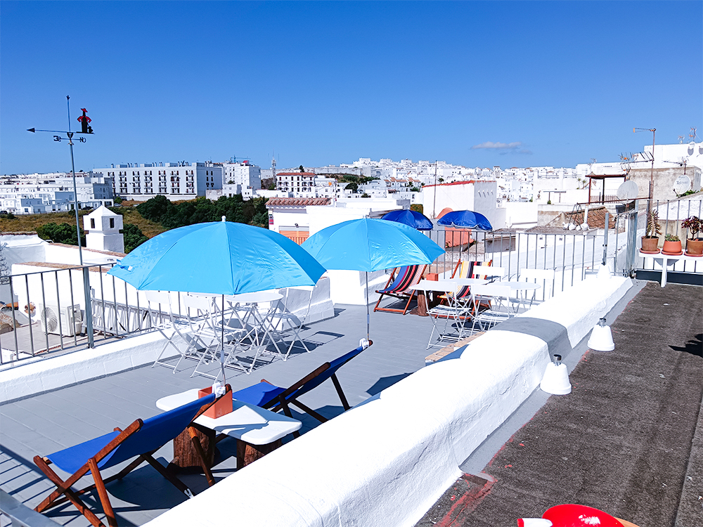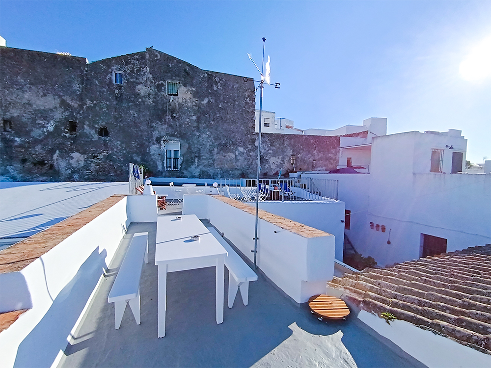 Grand toit terrasse aménagé adossé à la muraille avec une vue panoramique sour la mer & la côte marocaine proche. Les terrasses sont sécurisées par des barrières métalliques sur tout le pourtour. Idéal pour passer un moment convivial en famille ou avec des ami(e)s au petit déjeuner & apéritif. La tranquillité des lieux se prète idéalement à la pratique du Yoga, pour le moment zen de la journée.